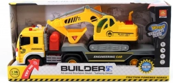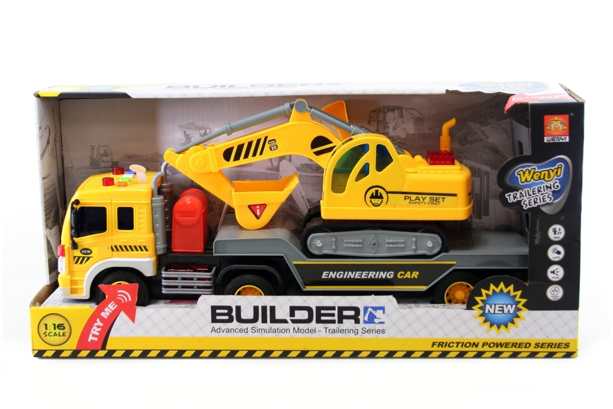 Oplev et actionfyldt byggesæt, der vil glæde enhver lille teknikelsker. Den store trækker med en funktionel vipbar rampe transporterer sikkert den medfølgende gravemaskine til enhver børnebyggeplads. Ved at trykke på de fire knapper på motorhjelmen afgiver trækkeren lydeffekter og lyssignaler, som forstærker den realistiske legeoplevelse.