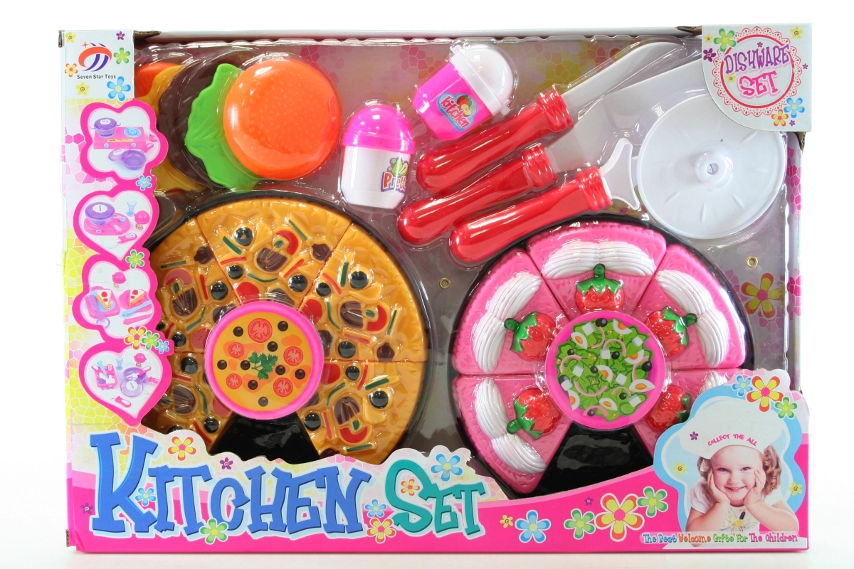 Dette farverige plastiksæt med service og mad giver børn timevis af kreativ leg. Med kagen og tærten opdelt i stykker kan børn øve sig i at skære, servere og dække bord. Sættet inkluderer også en hamburger, salt- og peberbøsse samt praktiske redskaber, der støtter udviklingen af finmotorik og fantasi.