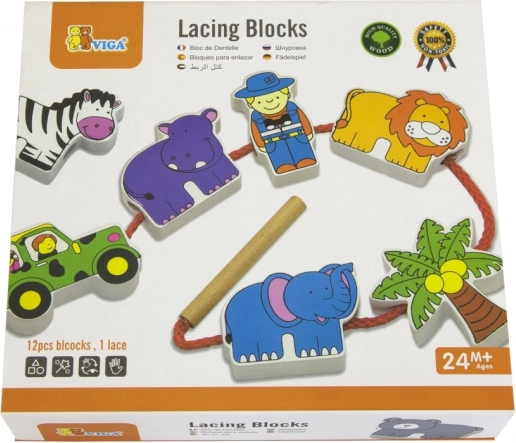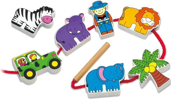 Sættet indeholder træklodser, der forestiller beboere fra safari, herunder leopard, palme, abe, flodhest, zebra, jeep, giraf, bjørn, løve, elefant og guide. Klodserne er omhyggeligt malet på begge sider med ugiftige farver og giver børn stor glæde ved leg. Alle elementer er designet til at støtte udviklingen af finmotorik og viden om dyrenes verden.