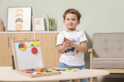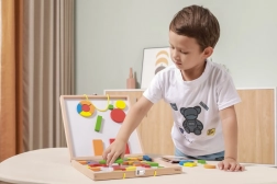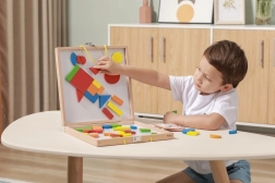 Dette alsidige magnetiske byggesæt giver børn uendelige muligheder for at sammensætte former, billeder og enkle mosaikker. Begge indersider af kufferten fungerer som en magnettavle, så delene holder sikkert på plads, og processen er både behagelig og overskuelig. De kompakte mål gør det ideelt til rejser, i bilen og på besøg.