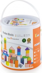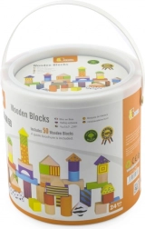 Dette alsidige sæt træklodser giver børn uendelige muligheder for at bygge tårne, broer og små huse. Delene ligger godt i hånden, har glatte kanter og er farvelakerede for en attraktiv og sikker leg. Den praktiske spand med hank gør det nemt at opbevare og transportere.