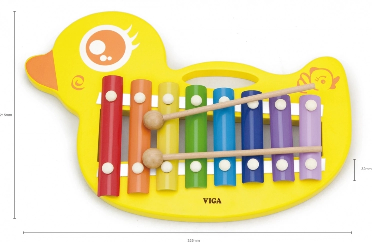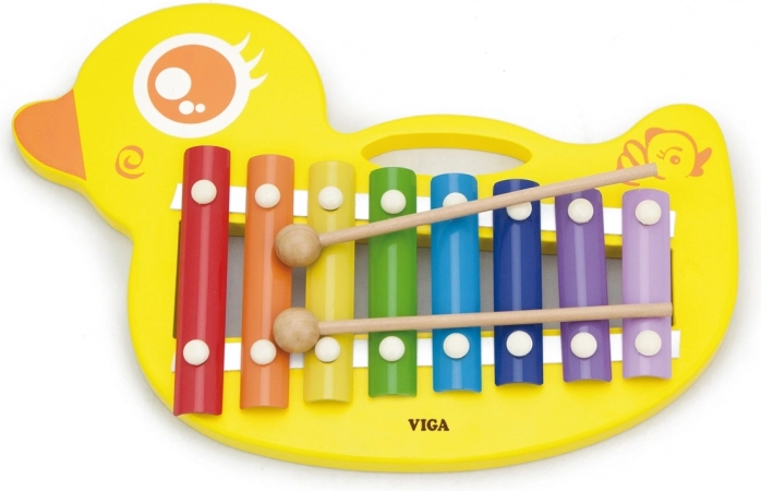 Farverig træxylofon formet som en and til børn fra 18 måneder. Udvikler musikalitet og motorik, 8 metaltunger, robust konstruktion og behagelig klang.