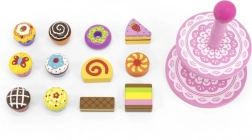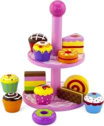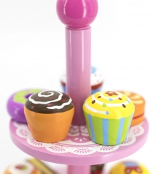 Dette stilfulde sæt med trædesserter på et todelt etagefad er ideelt til leg som café, teselskab eller børne-konditori. De veldesignede træstykker i livlige farver indbyder til udforskning og træner hånd-øje-koordination.