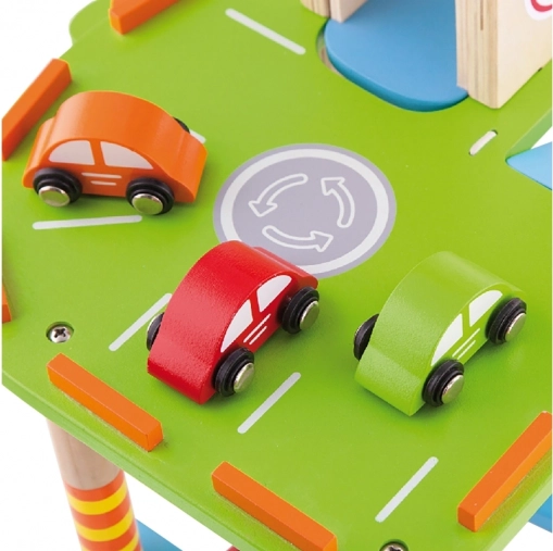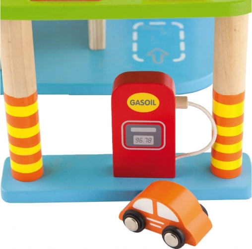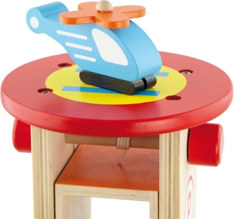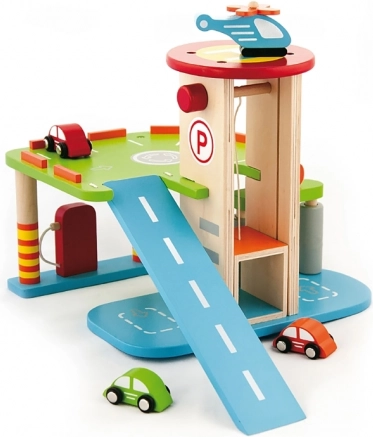Denne kvalitets-trægarage tilbyder flere parkeringsniveauer, landingsplads til helikopteren og en praktisk elevator til nem flytning af bilerne mellem etagerne. Takket være det gennemtænkte design med baner, skilte og tilbehør træner børnene deres koordination og udvikler fantasien.