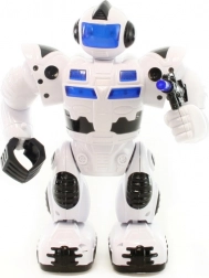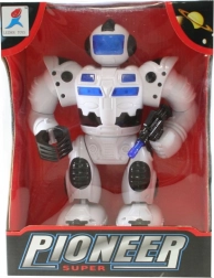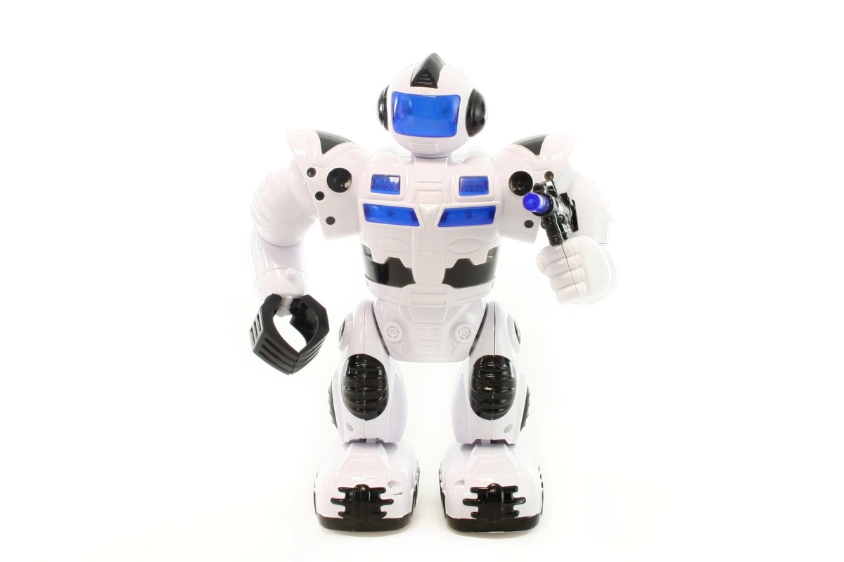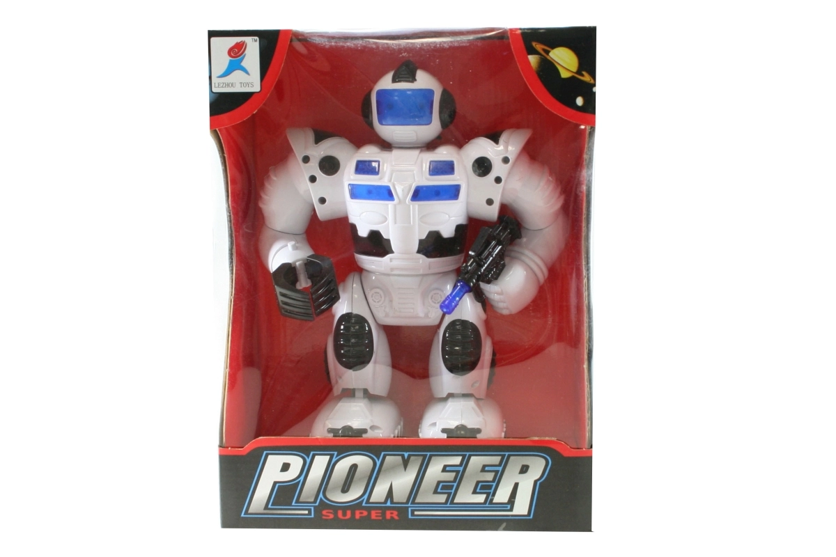 Batteridrevet robot, der går, lyser og udsender lyde, bevæger arme og hoved. Drives af 4x AA-batterier (medfølger ikke). Robotstørrelse ca. 23 x 17 cm. Alder 3+