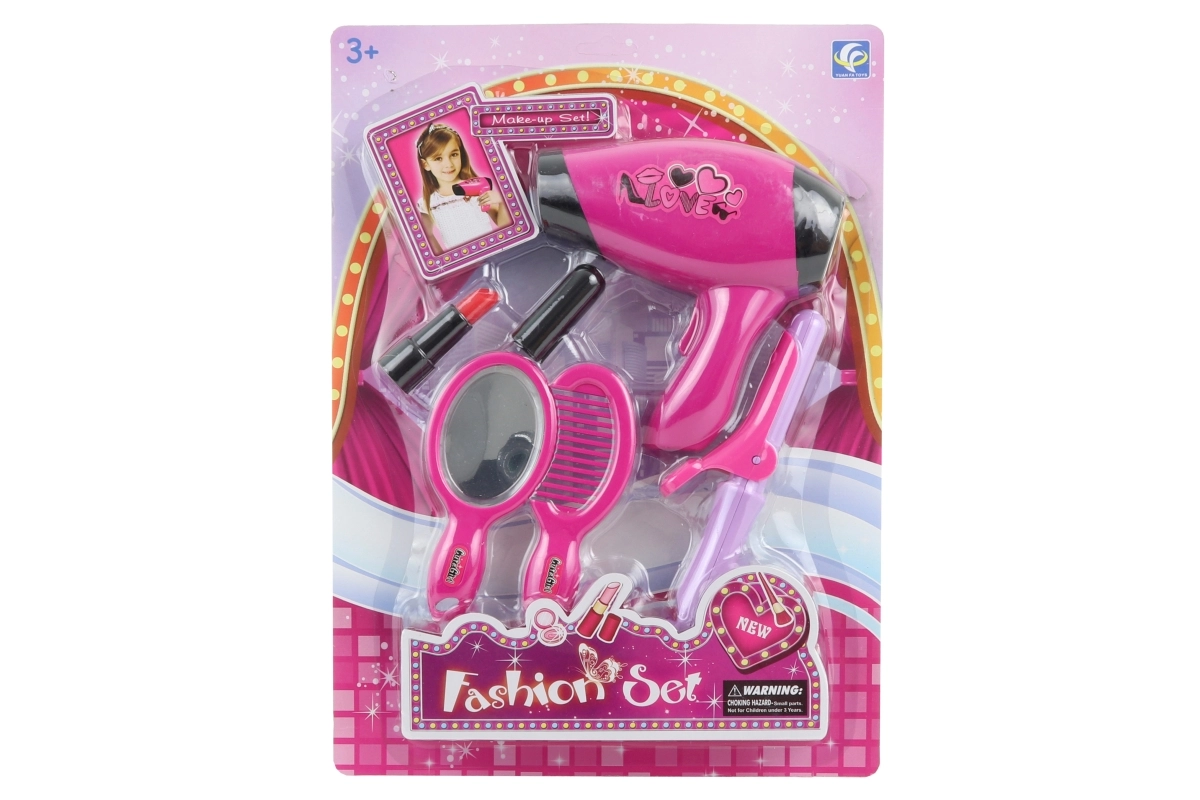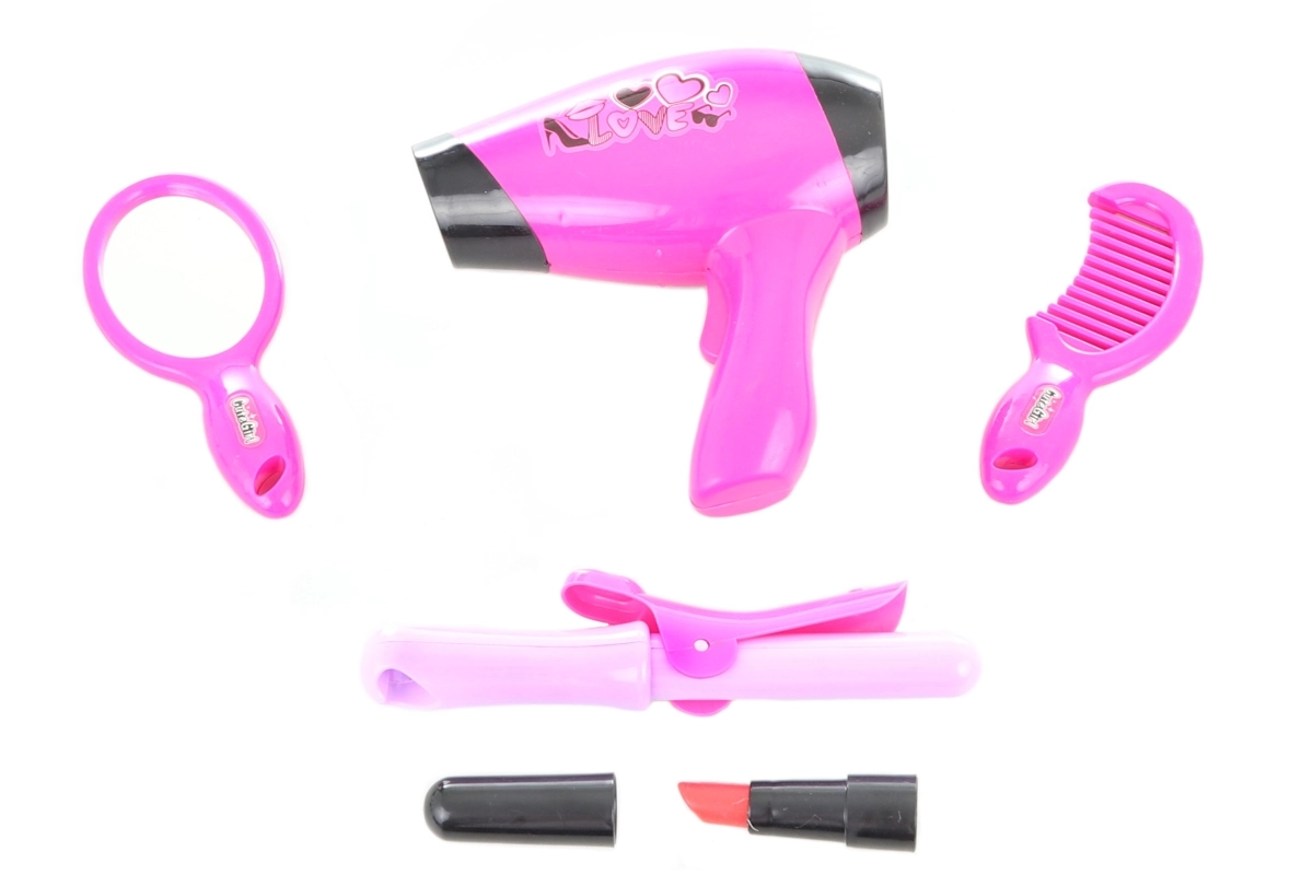 Dette lyserøde skønhedssæt giver børn alt, hvad de behøver til de første frisøreksperimenter. Den batteridrevne hårtørrer (1× AA, medfølger ikke) suppleres af et krøllejern, en kam, et håndspejl og kosmetiske tilbehør – alt tilpasset små børnehænder.