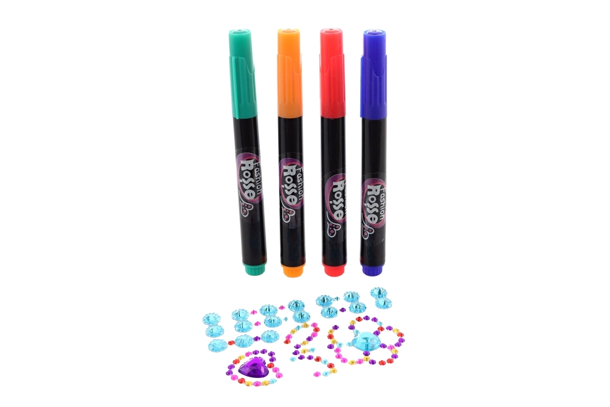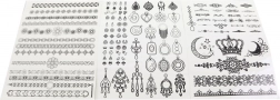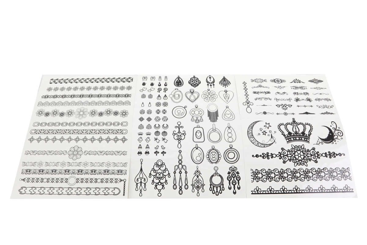 Opdag en verden af midlertidige tatoveringer og pynt, som du kan tilpasse præcis efter humør. Sættet byder på et rigt udvalg af motiver – fra elegante linjer og kæder til kroner, måner og ornamenter – samt farvede tuscher til at tegne detaljer. De glitrende sten giver hvert motiv en iøjnefaldende glans.