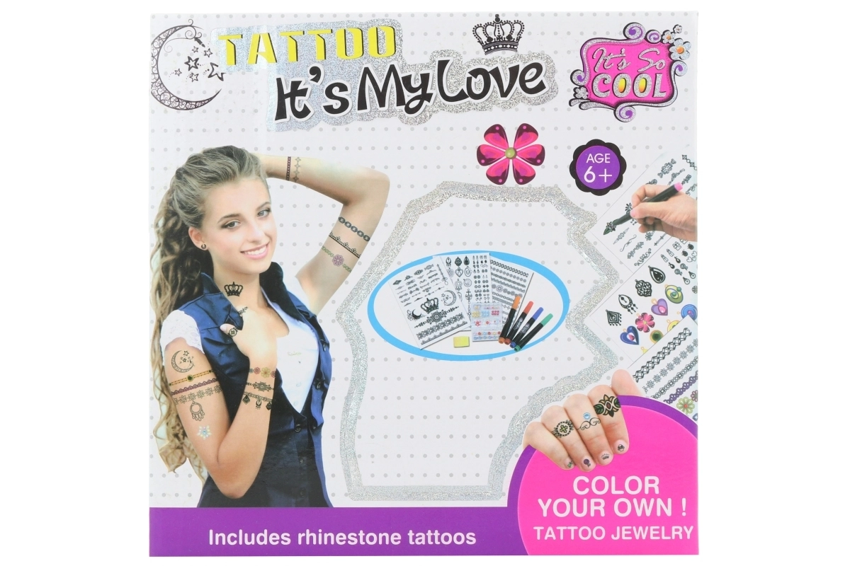 Lav din egen midlertidige body art med dette kreative tatoveringssæt til børn fra 6 år. Indeholder op til 115 designs, 6 farvede tatoveringstuscher, dekorative sten og en svamp for nem påføring. Perfekt til glitrende tatoveringer, pynt af hænder og arme samt udvikling af fantasi og kreativitet.