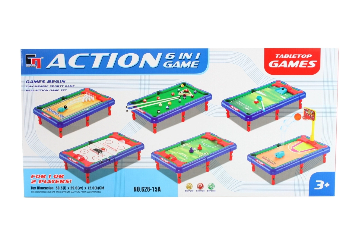 Dette multifunktionelle sæt af bordspil bringer seks populære spil i én praktisk løsning. De kompakte mål passer på ethvert bord og giver alligevel rigelig plads til dynamisk leg. Børn kan nemt prøve forskellige discipliner og træne præcision, hurtige reaktioner og teamwork.