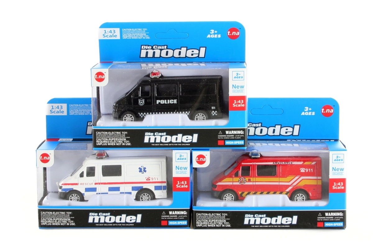 Disse metal-redningsbiler vil glæde enhver lille fan af brandvæsen, politi og redningstjeneste. Takket være den solide konstruktion og friløb er de lette at styre og kører godt på alle overflader. De kompakte mål er ideelle til børnehænder og på farten.