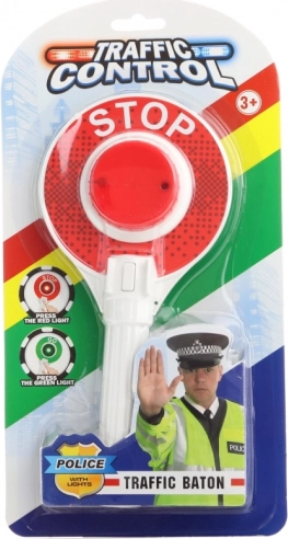 Politiskilt med lys. Lyser rødt på den ene side og grønt på den anden. Drives af 2x AA-batterier (medfølger i pakken). Skiltets længde ca. 23 cm. Pakkens mål ca. 30 x 16 x 3 cm. Alder 3+.