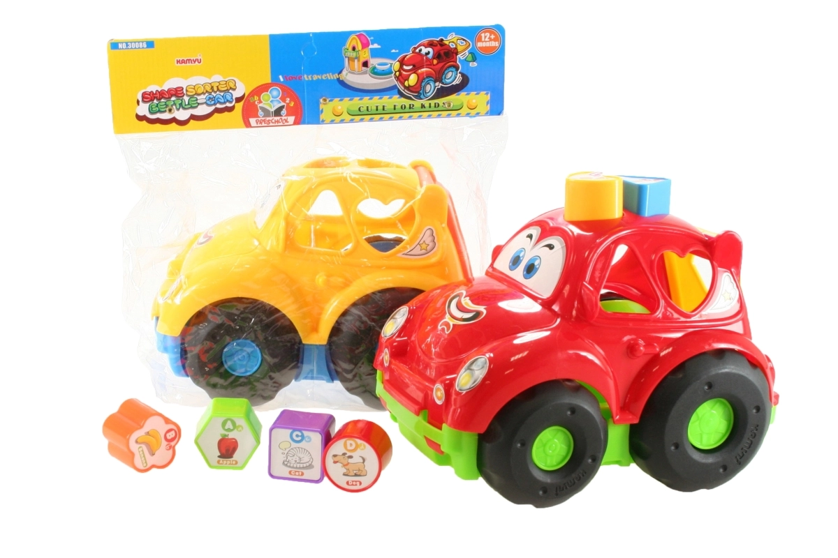 Muntert plastlegetøjsbil med indsætningsfunktion. Bilens størrelse er ca. 22 cm. Indeholder 6 indsætningsklodser med bogstaver og billeder. Alder 12 mdr+