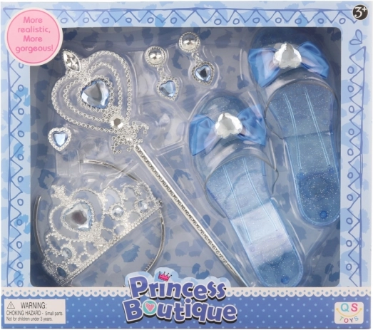 Magisk sæt af tilbehør til prinsesse: sko, krone, septer, ring og øreringe. Ideelt til rolleleg. Pakke 32 × 28 × 5 cm, alder 3+.