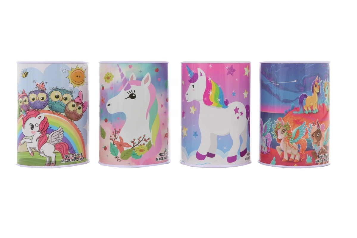 Denne sparebøsse i blik med et magisk enhjørningemotiv er en fantastisk hjælp til at opbygge sunde økonomiske vaner hos børn. Robust metaludførelse tåler daglig brug, og takket være de kompakte mål passer den både på en hylde og et skrivebord.