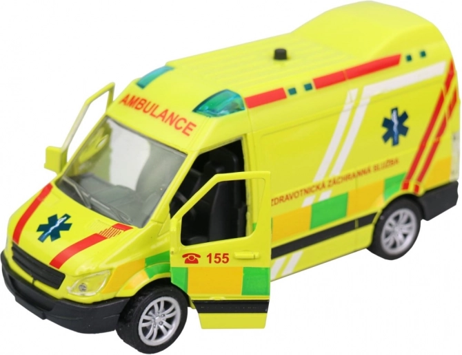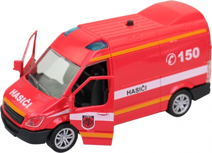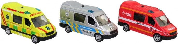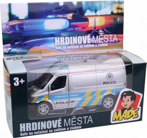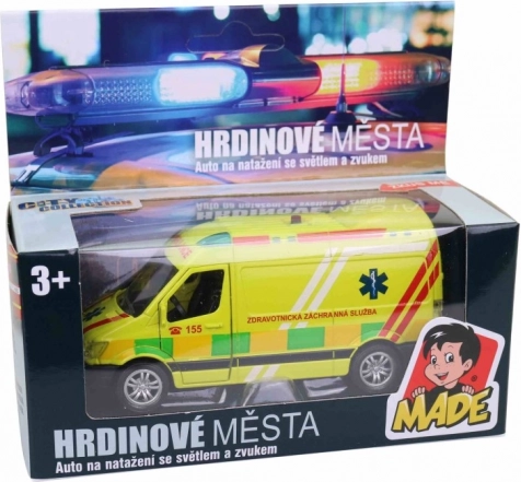 Redningsbil Byens Helte med lys og lyd, pull-back. 3 varianter: ambulance, politi, brandvæsen. Strømforsyning 2× LR41.