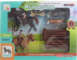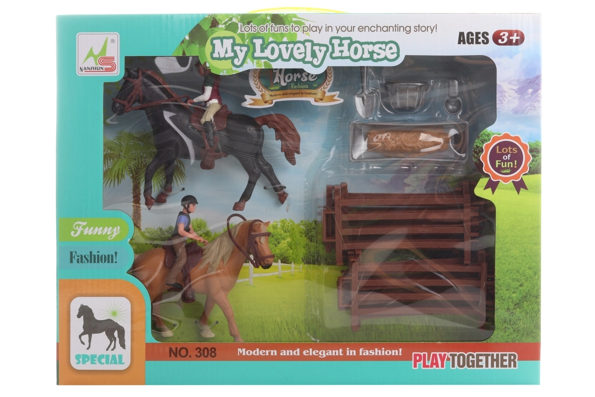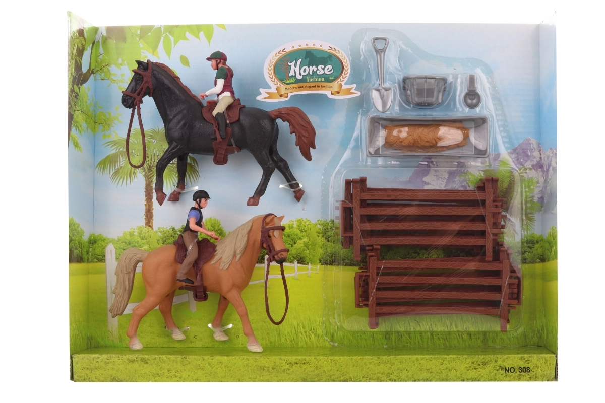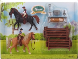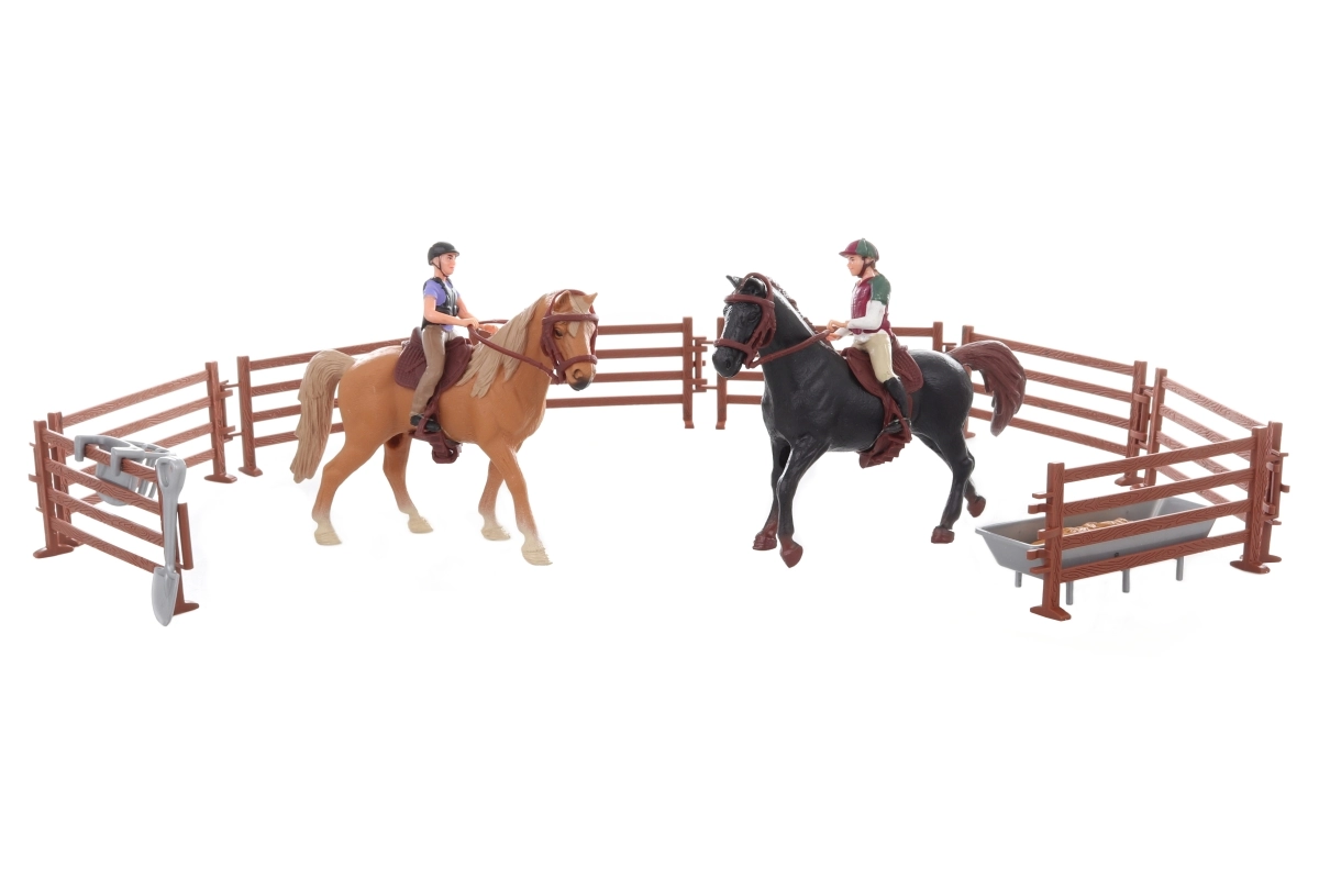 Dette hestesæt med tilbehør giver børn timevis af kreativ leg. Med to heste og to ryttere kan børn skabe deres egne ridehistorier, kapløb og pleje af dyrene. Sættet indeholder en fold og andre små dele, der beriger legen og styrker fantasien.