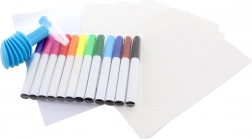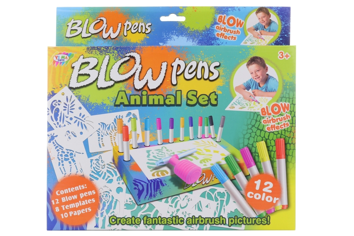Med dette store sæt blæse-tuscher kan børn nemt skabe originale billeder med safari-dyr. Takket være mundstykket med pumpe kræves der ikke en stærk udånding – farven påføres i en blid strøm og skaber flotte overgange og skyggeeffekter. Den praktiske stand og holder holder tuscherne pænt organiseret samlet.
