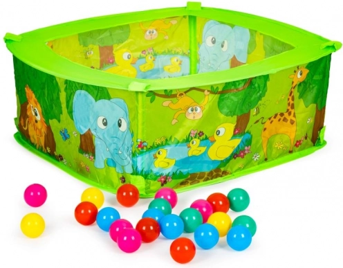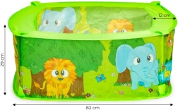 Indhegning med bund og 50 bolde – ikke til vand, med mål ca. 75 cm x 75 cm x 30 cm. Pakken indeholder 50 bolde. Bassinet kan bruges derhjemme på børneværelset, men også udendørs i haven om sommeren. Børn vil have masser af sjov, når de leger. Alder 6 m+.