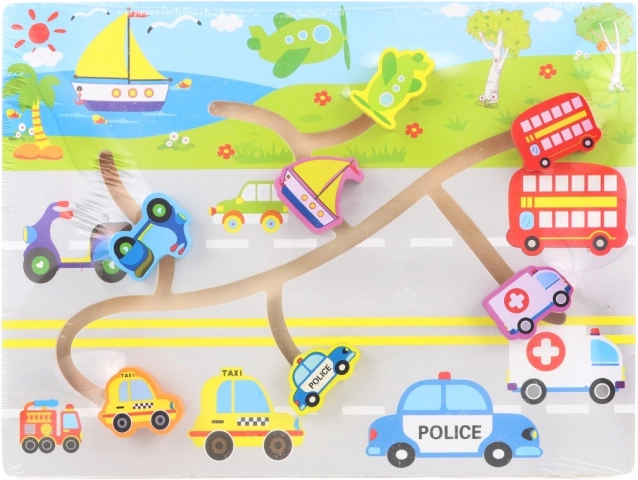 Trælabyrit med transporttema. Udvikler finmotorik og logik. Mål 30 × 22,5 × 2,5 cm, velegnet fra 3 år.