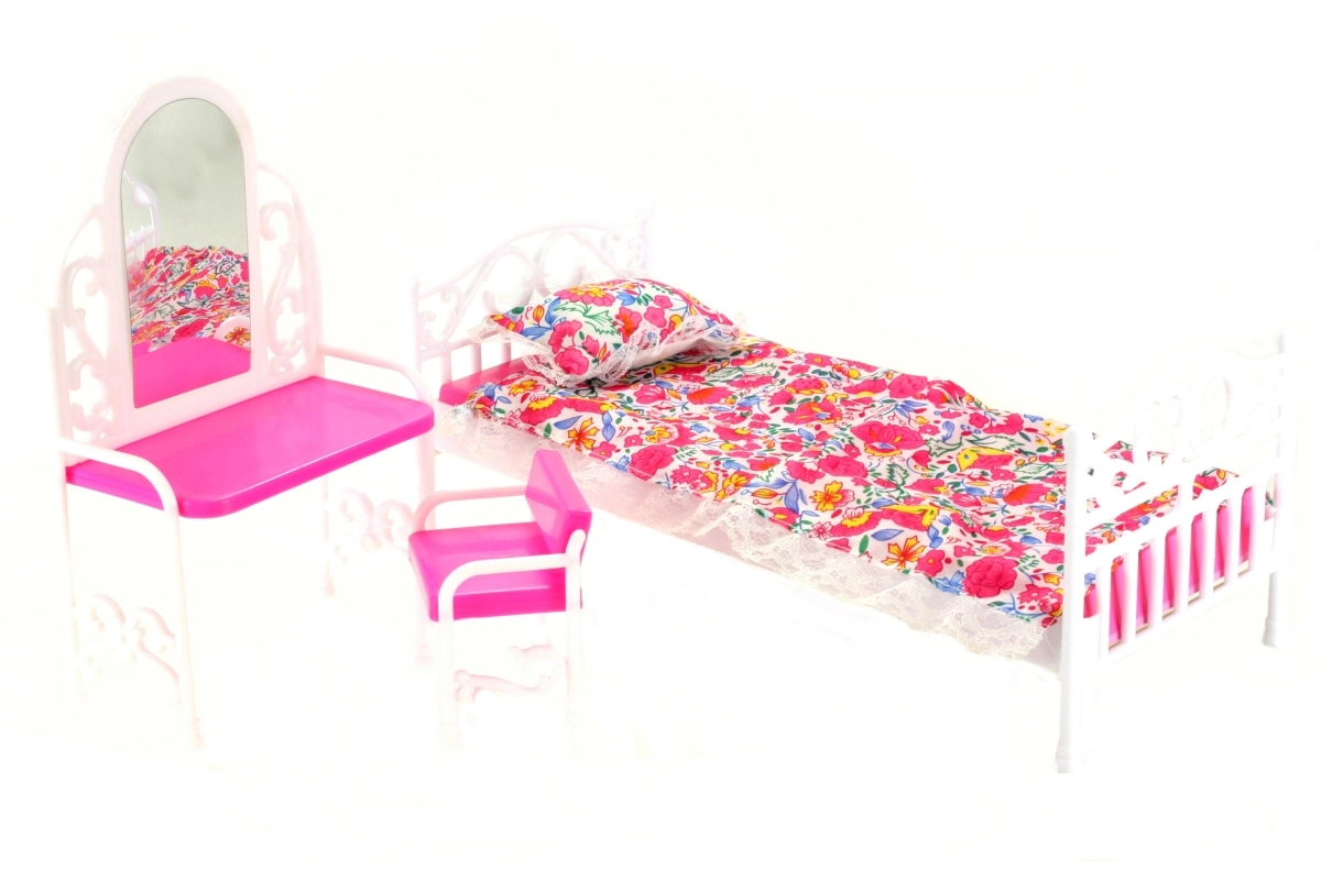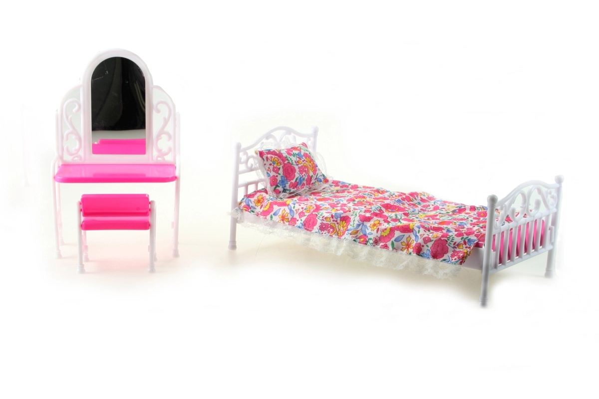 Oplev det charmerende Glorie-sæt, som bringer en dukkeseng med blødt sengetæppe og pude, et toiletbord med spejlfilm samt en praktisk stol. Passer perfekt til de fleste almindelige dukker og supplerer dukkernes værelse med et hyggeligt sted til både hvile og pynt.