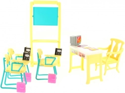 Pakken indeholder en rummelig tavle, lærerkrog med computer og stole til eleverne. Takket være de kompakte mål er sættet kompatibelt med almindelige dukker og let at opbevare.