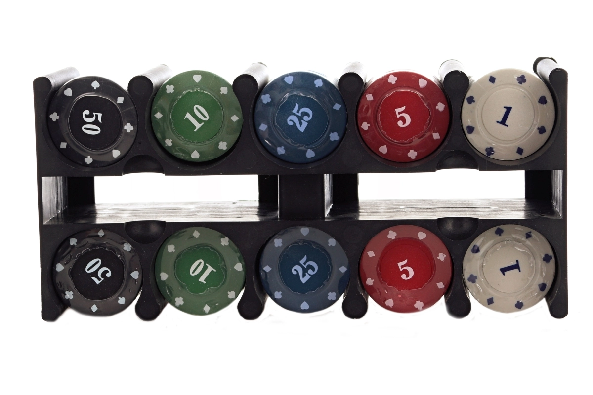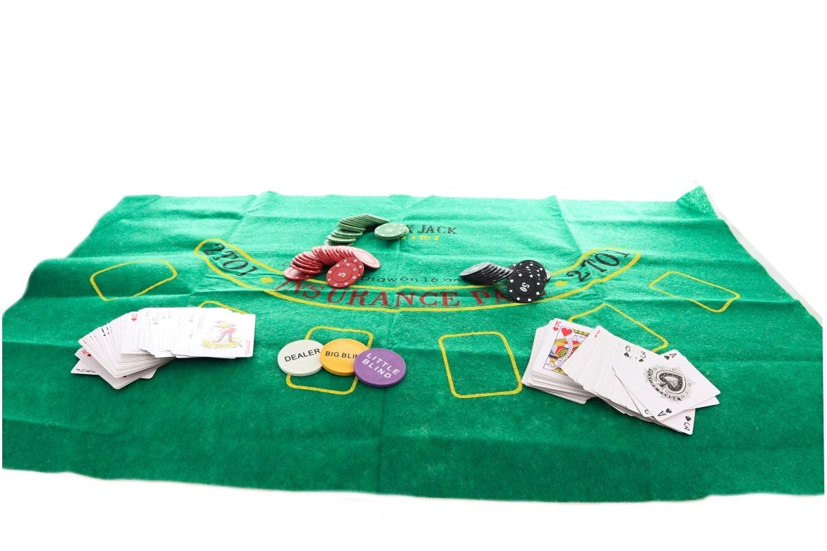 Sættet indeholder jetoner i forskellige farver og værdier, spillekort og en dealer-knap for en autentisk spilleoplevelse.
