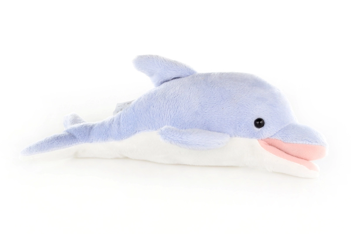 Den lyseblå plysdelfin er en fantastisk makker til hverdagsleg og beroligende puttetid. Takket være blød plys og omhyggelig syning vinder den hjertet hos både børn og voksne. Den kompakte længde på 25 cm gør det nemt at tage delfinen med overalt – i børnehave, på tur eller ferie.