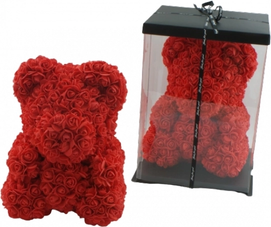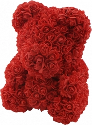 Romantisk gavehit: bamse lavet af kunstige roser, 40 cm høj. Dette søde dekorative kærlighedssymbol er ideelt til Valentinsdag, jubilæer og gaver til kæresten. De holdbare roser bevarer form og farve, så den forbliver en smuk souvenir fra særlige øjeblikke.