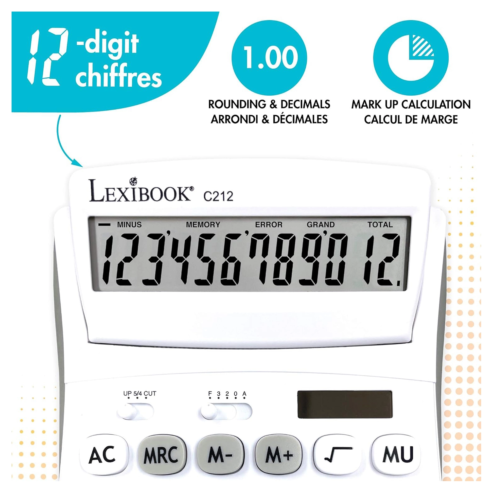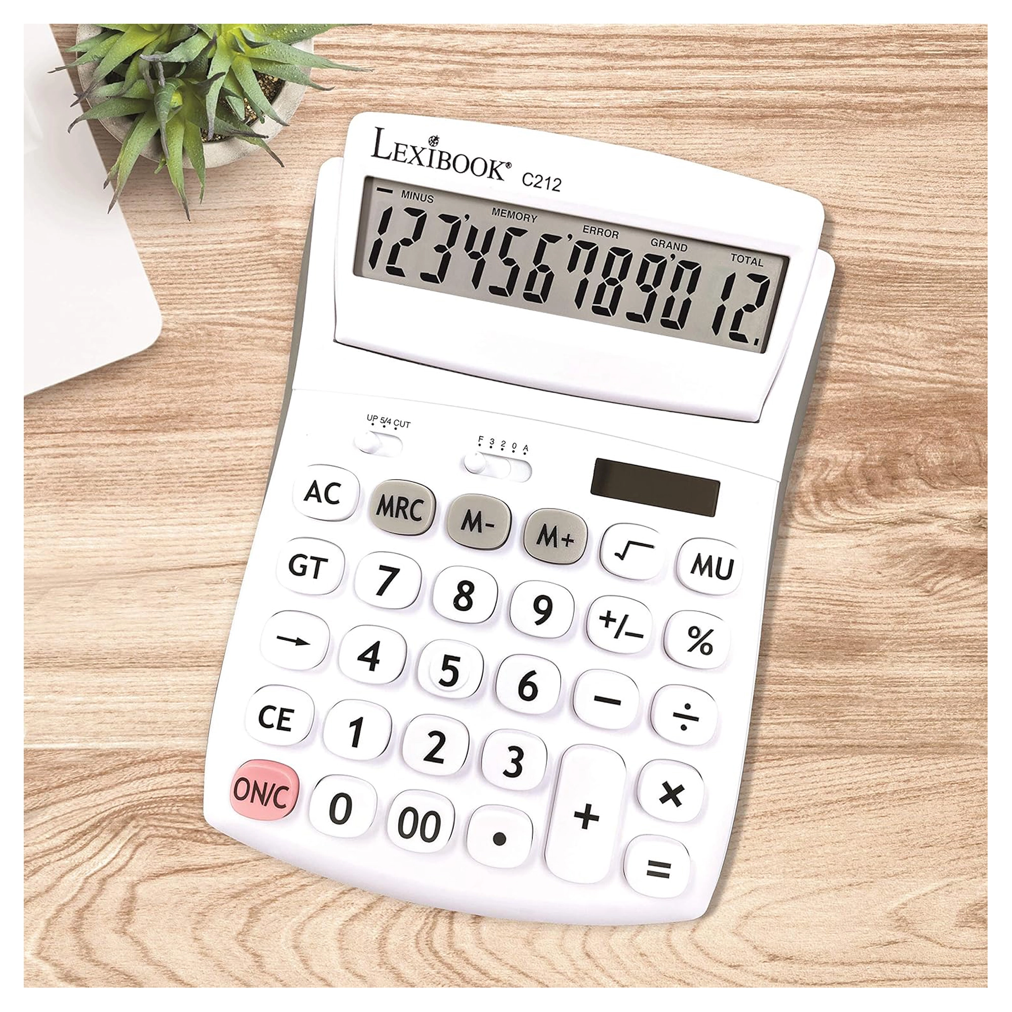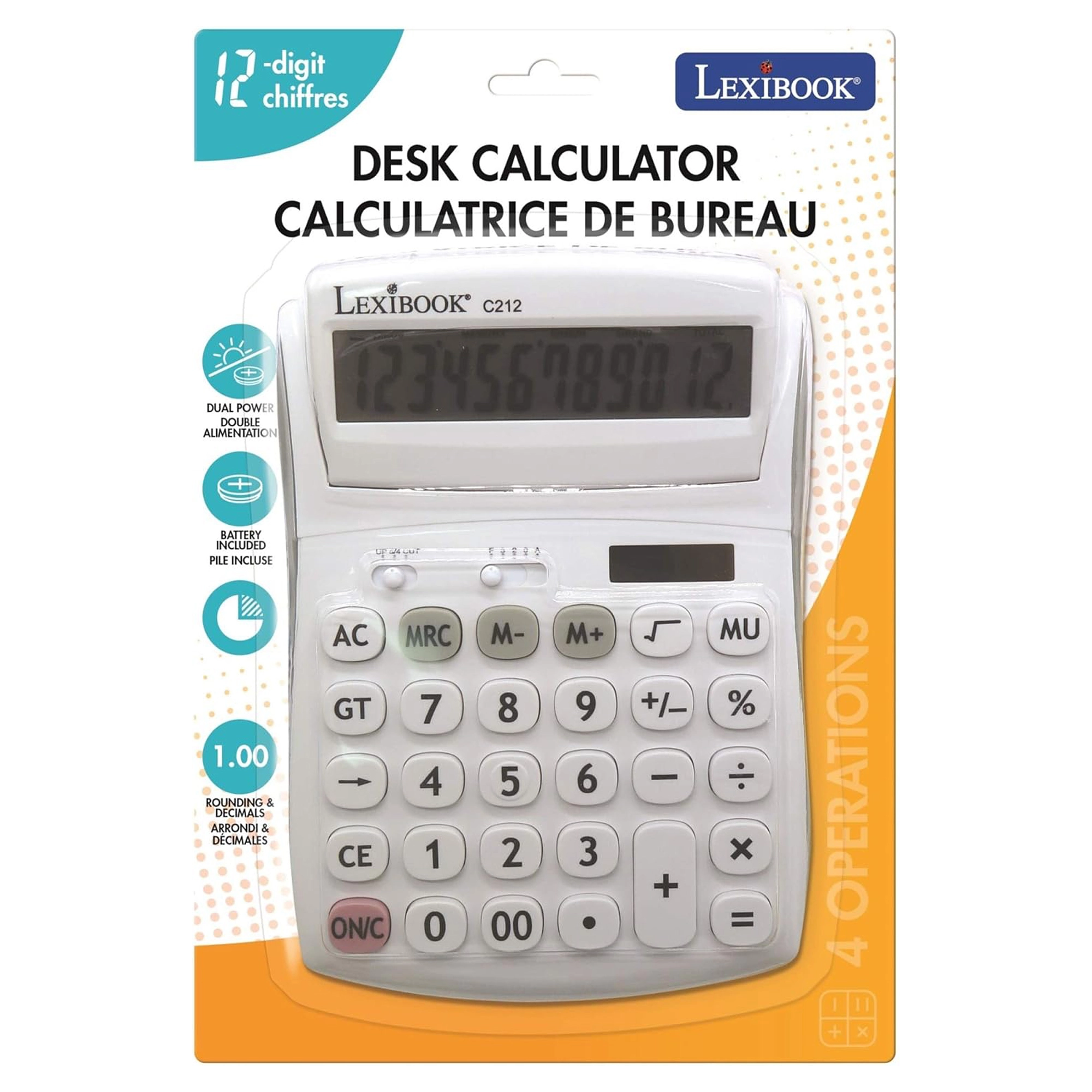 Praktisk 12-cifret bordregnemaskine til kontor, skole og hjem med stor vipbar skærm, holdbare gummibelagte taster og dobbel strømforsyning (AG10-batteri + solceller). Mulighed for valg af decimaler og afrunding, hukommelse til 3 tal, funktioner til procenter, kvadratrod og avanceberegning samt rettetast til sletning af de sidst indtastede cifre.