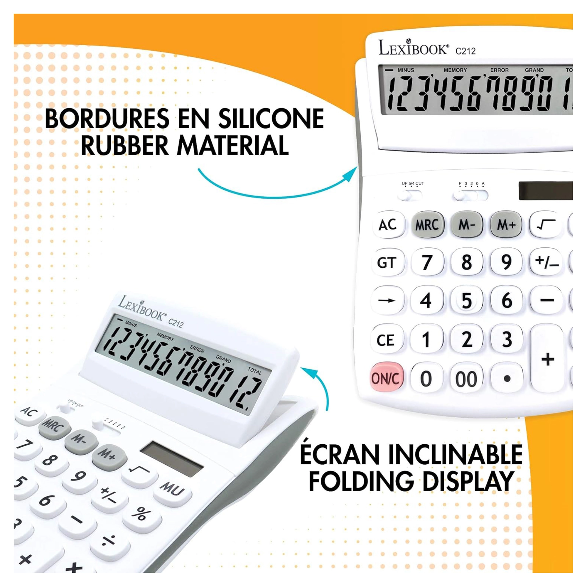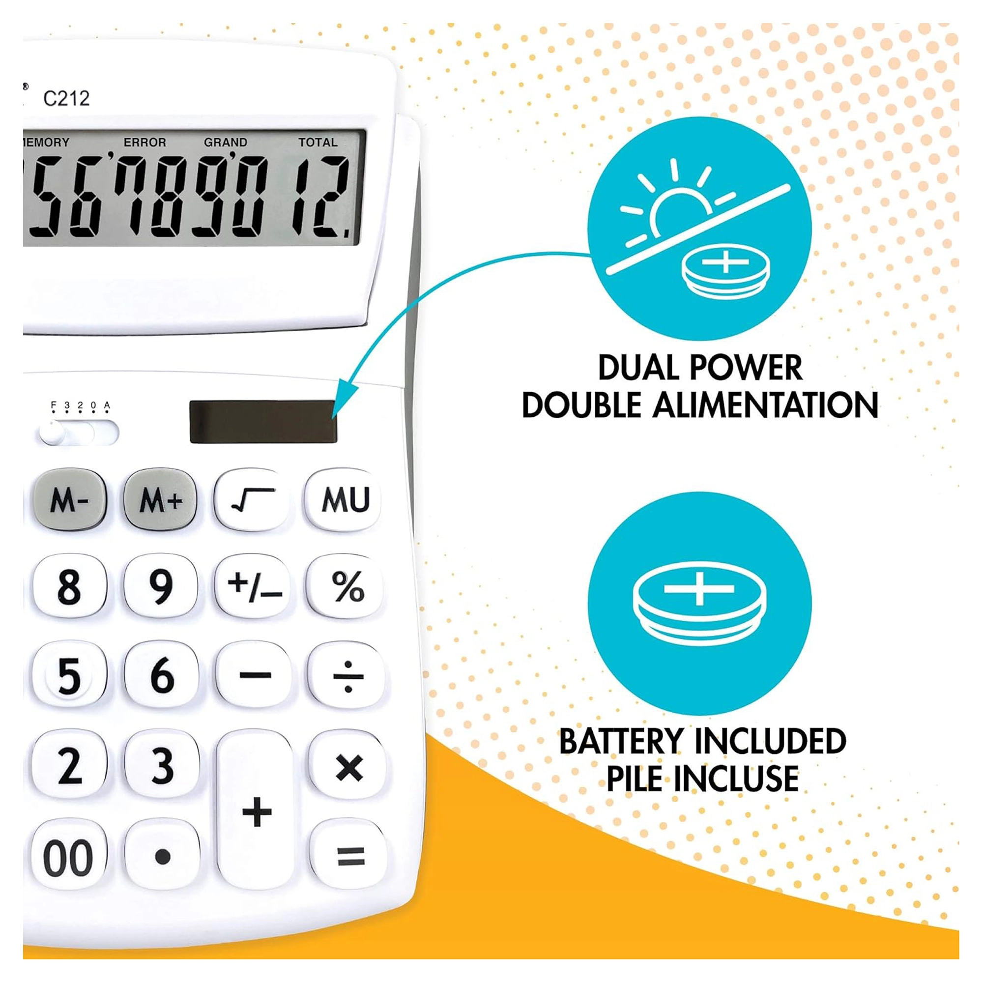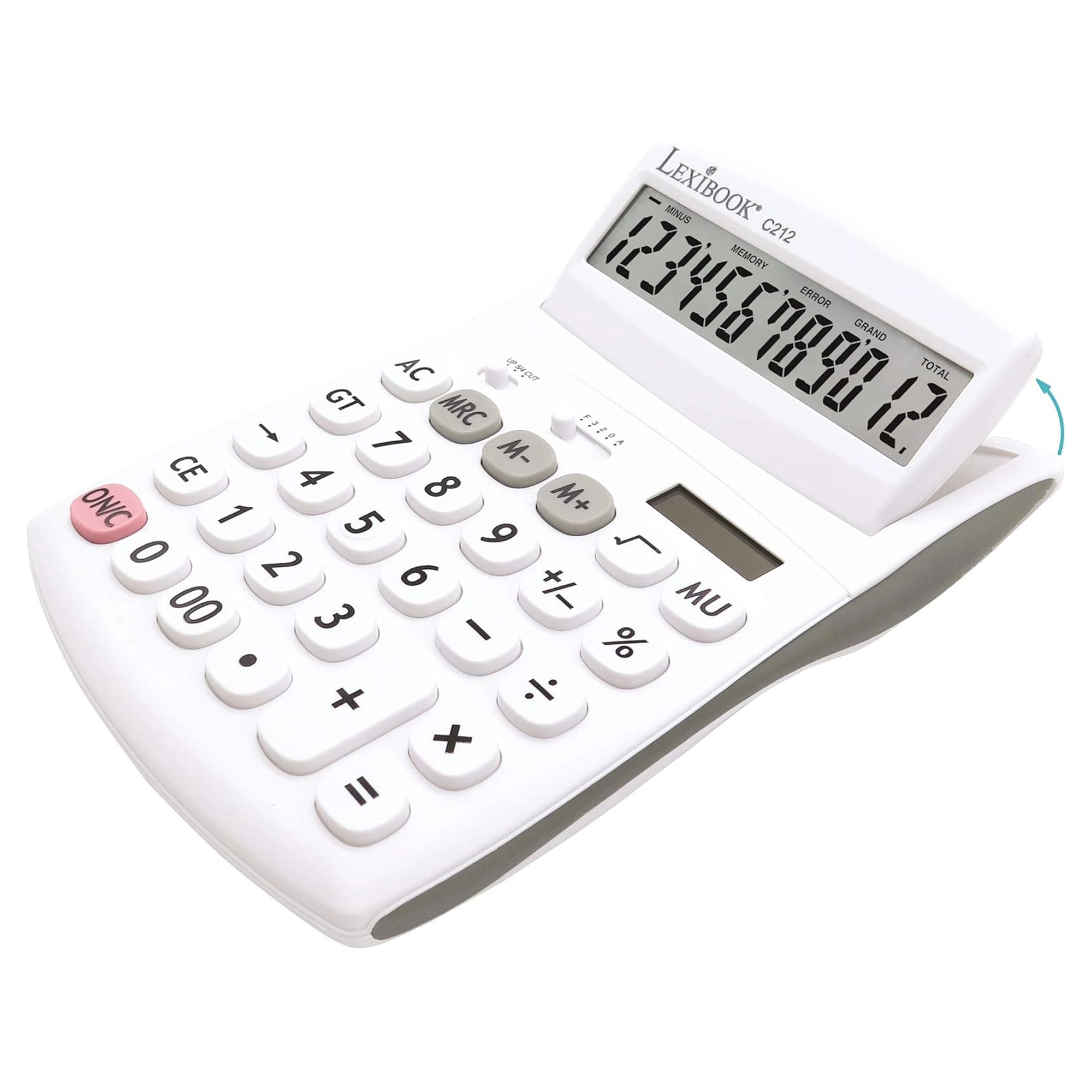 Praktisk 12-cifret bordregnemaskine til kontor, skole og hjem med stor vipbar skærm, holdbare gummibelagte taster og dobbel strømforsyning (AG10-batteri + solceller). Mulighed for valg af decimaler og afrunding, hukommelse til 3 tal, funktioner til procenter, kvadratrod og avanceberegning samt rettetast til sletning af de sidst indtastede cifre.
