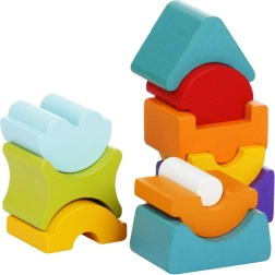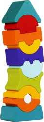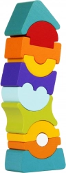 Afrundede dele gør det muligt at bygge tårnet lige eller vippe det til siderne. Børn øver tålmodighed, koordination og rumlig forståelse ved hvert forsøg.