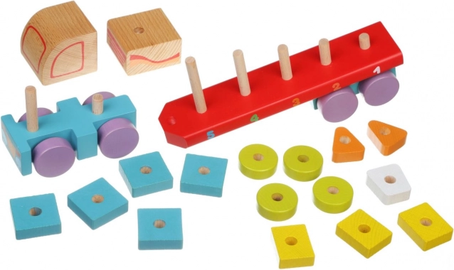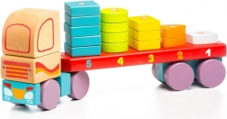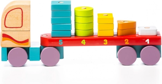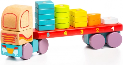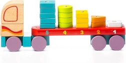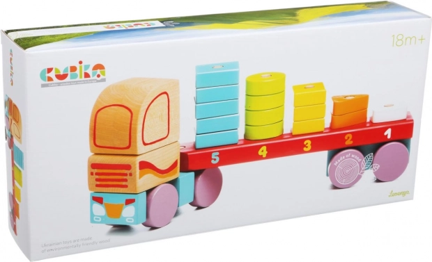 Trækonstruktionslegetøj CUBIKA Lastbil med geometriske former er mere end blot legetøj. Med 19 farvede dele kan børn lære at matche former og farver, hvilket styrker deres sansemotoriske færdigheder. Hver del er designet til at passe sammen med de andre, og mere øvede små byggere kan kontrollere, om antallet af stablede dele er korrekt ved hjælp af cifrene på lastbilens chassis.