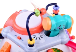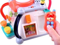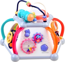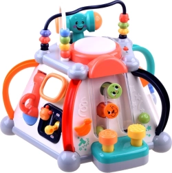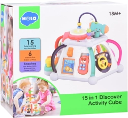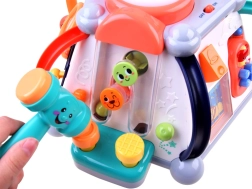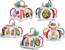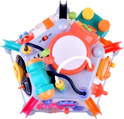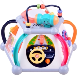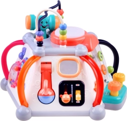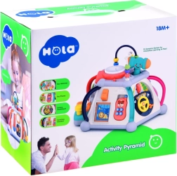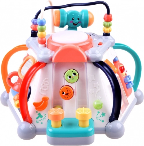 HOLA multiterningen tilbyder et rigt udvalg af aktiviteter for de mindste. Hver side giver en ny type leg – fra at styre en lille bil til tandhjul med lys og melodier samt en mikrofon med bagbelyst “tv”. På toppen finder du perlelabyrinter, en lysende tromme og plads til opbevaring af hammeren. Alt er designet til små børnehænder og sikker udforskning.