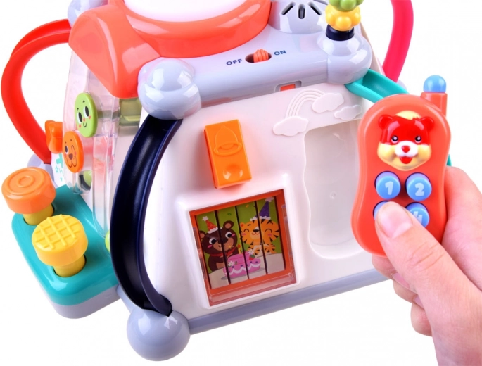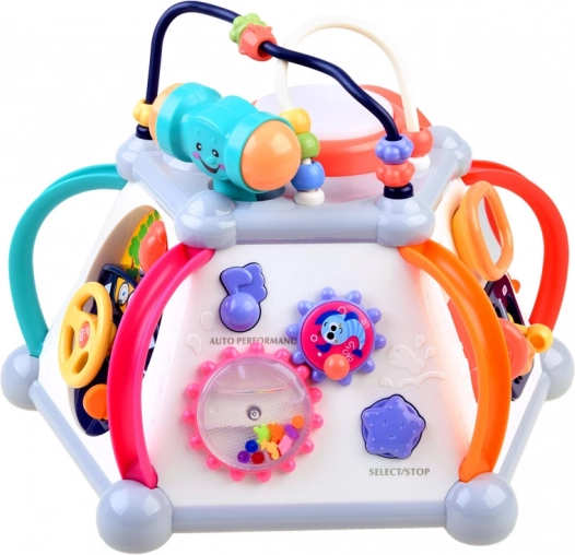 - Rat med horn og motorlyd, tandhjul med melodier og lys, udtrækkelig mikrofon med volumenstyring, side med hammer og kugletunnel, telefon med knapper og billedskift, lysende tromme, perlelabyrinter