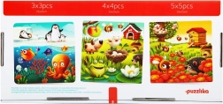 Oplev legende læring med puslespillet Puzzlika yndlingsdyr 3 i 1. Sættet indeholder i alt 50 store brikker, som børn samler til 3 separate billeder på 25 × 25 cm med forskellig sværhedsgrad (3×3, 4×4, 5×5). Takket være de farverige dyremotiver og de klare farver er puslespillet både attraktivt og motiverende for førskolebørn.