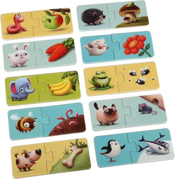 Denne logiske leg lærer børn at matche dyret med dets yndlingsmad – for eksempel elefant, pindsvin, frø eller regnorm. Når parret er samlet, styrker børnene på legende vis deres viden om dyr og deres føde, samtidig med at de træner iagttagelsesevne og hånd–øje-koordination.