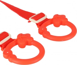 Legetøjet fastgøres let til bagsiden af sædet ved hjælp af plastikringe, som sikrer stabilitet og sikkerhed.