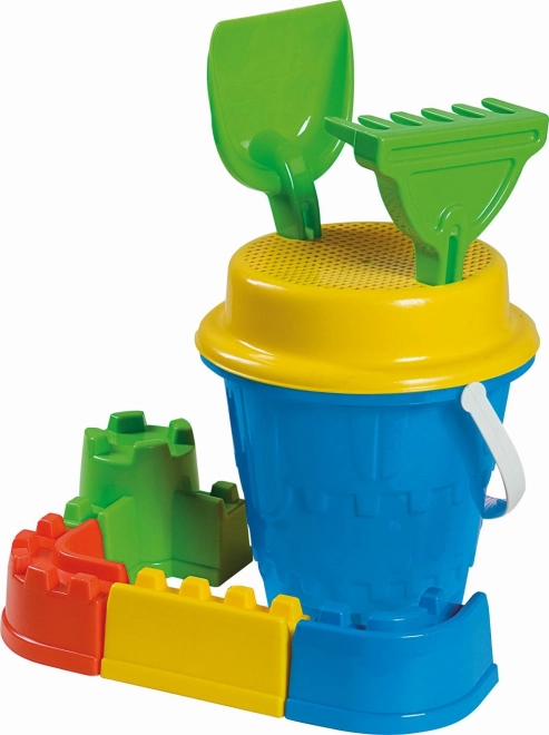 ANDRONI mellemstort 8-delt sandlegesæt: borgformet spand, si, skovl, rive og 4 murforme. Kvalitetsplast, fremstillet i Italien, fra 12 måneder.
