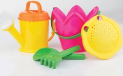 Dette 5-delte sandsæt fra ANDRONI rummer alt, hvad børn behøver til kreativ leg på stranden eller legepladsen. Spand formet som en tulipan, vandkande, si, skovl og rive understøtter udviklingen af motorik og fantasi. Plastikken er fremstillet i Italien, er stærk, fleksibel og modstandsdygtig over for revner ved almindelig brug.