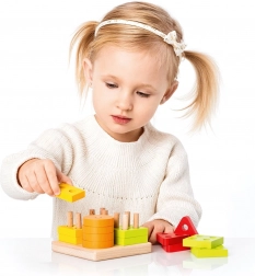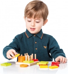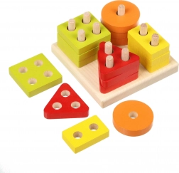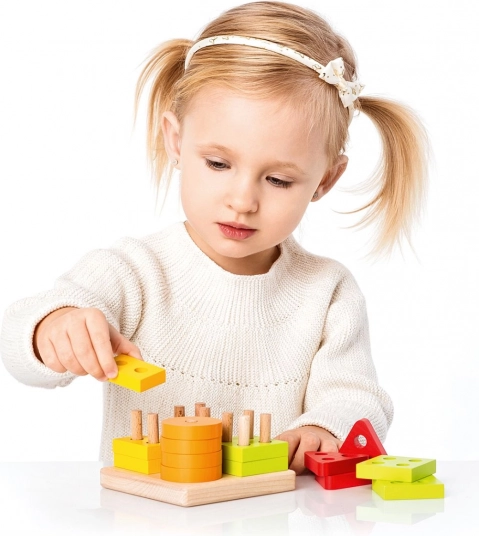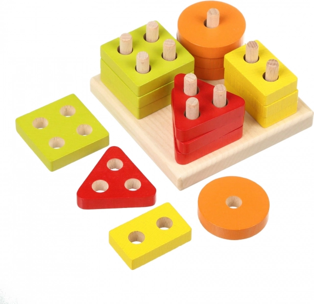 Farvede cirkler, kvadrater, trekanter og rektangler med huller sættes på basens pinde. Børn sorterer naturligt efter både form og farve og træner logisk tænkning.