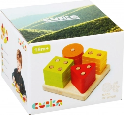 Den didaktiske legetøjsserie CUBIKA Sortér former indeholder 16 farvede, perforerede geometriske dele samt en solid kvadratisk base med pinde. Børn opdager naturligt forskelle mellem former og farver, træner greb og hånd–øje-koordination og udvikler fantasi og tålmodighed. Omhyggelig udførelse i ahorn- og bøgetræ samt holdbare, sundhedsmæssigt ufarlige vandbaserede farver sikrer lang levetid og sikker leg.