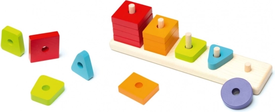 Takket være de forskellige geometriske brikker og gentagende farver lærer børn nemt at sortere, parre og placere korrekt på basens pinde.