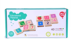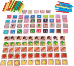 Pakken indeholder trækort med tal, prikker som på terninger, billeder af frugt og grøntsager samt matematiske tegn og farvede tællestave på 8 cm. Delene er behagelige at røre ved og robuste til daglig leg.