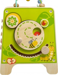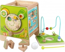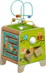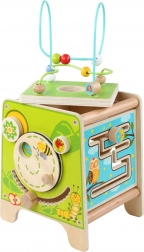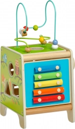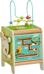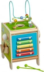 Denne farverige træ-aktivitetskube giver børn timevis af meningsfuld leg. Den øverste perlelaby­rinth kan tages af og vendes ned i kuben for nem opbevaring. På siderne finder børn en xylofon med køller, en formsortering med todelte roterende geometriske figurer, et motorisk labyrintspor, et roterende hjul, drejeelementer og et sjovt spor med en pind, der skubbes gennem en rille.