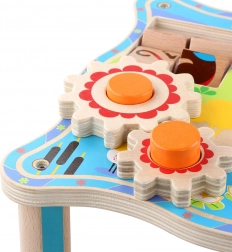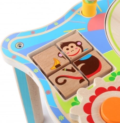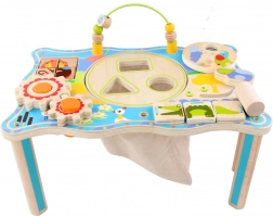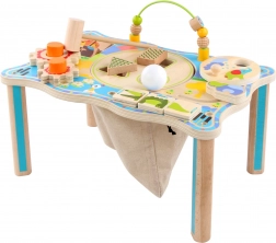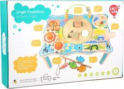 Træbordet med junglemotiver forener leg og læring og styrker finmotorik, hånd–øje-koordination og logisk tænkning. Børn kan dreje tandhjul, flytte perler på banen, træne styrke og fokus med bankesættet og øve formgenkendelse med formsortereren. I midten er der en linnedpose til fangede fisk og spillebrikker, som holder legeområdet ryddeligt.