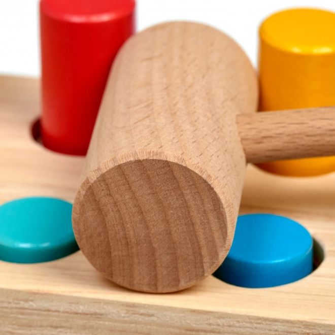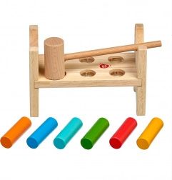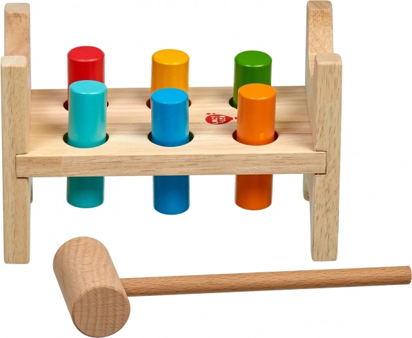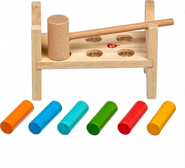 Seks farvede pinde og en træhammer lærer børn præcist greb, slagstyrke og øje–hånd-koordination.