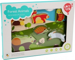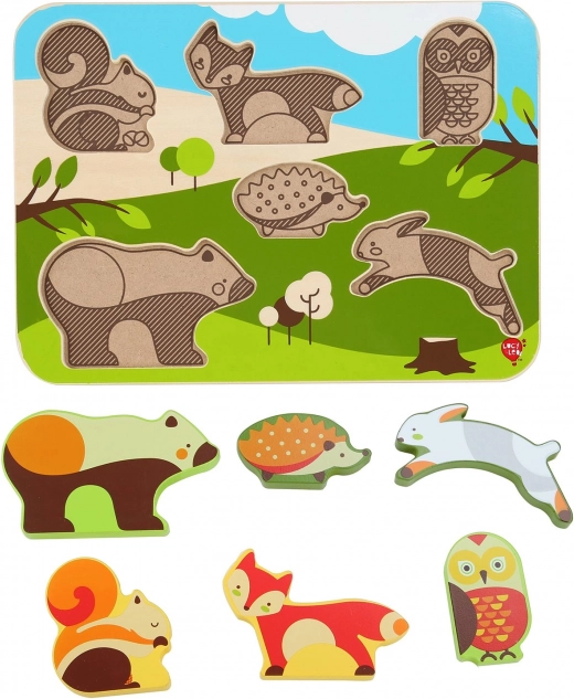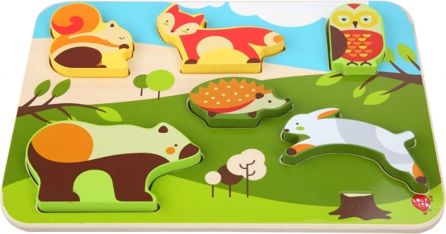 Lucy & Leo indsats-puslespil med skovdyr indeholder 7 farverige træbrikker uden knopper, som børn nemt kan gribe og lægge i de passende felter. Hver brik er tilstrækkeligt tyk til at kunne stå selvstændigt, hvilket udvider lege- og fantasi-mulighederne.