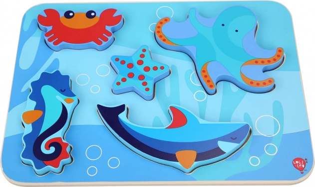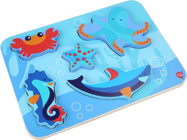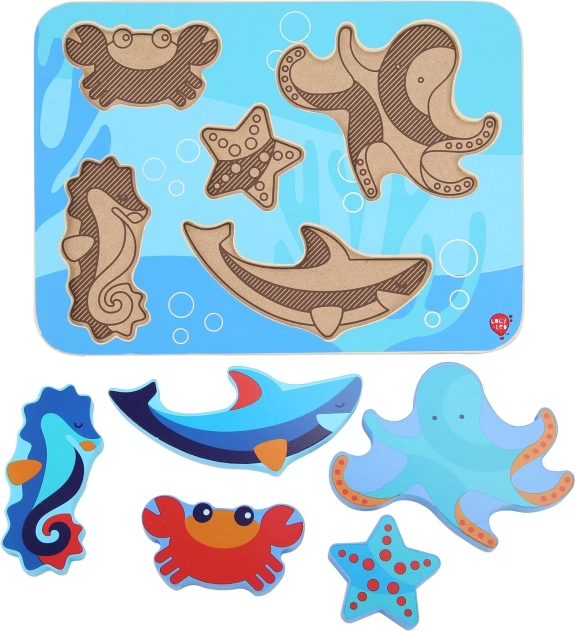 Dette træpuslespil med havdyr er designet til læring gennem leg. Seks farverige brikker – for eksempel blæksprutte, søstjerne og søhest – passer præcist i de udfræsede former på den robuste plade med oceanmotiv. Brikkerne er store nok til at ligge godt i hånden og kan takket være deres tykkelse også stå selv.