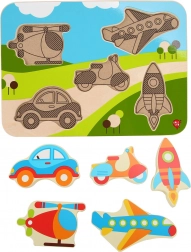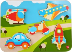 Dette kvalitets træpuslespil med temaet transportmidler imponerer med klare farver og tydelige former, som børn nemt kan gribe og lægge på plads. Nogle brikker kan takket være deres tykkelse endda stå selv, så børnene kan lege med dem også uden for pladen.