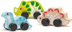 Sættet indeholder tre trædinosaurer med hjul for nem bevægelse, ideelt til små børn.